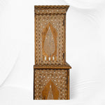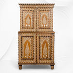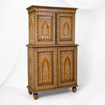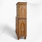 This vintage Indian wardrobe is something truly unique. It's made from strong teak wood and adorned with intricate bone decorations shaped like leaves and vines. With two handy drawers at the bottom and a roomy cupboard on top, it offers plenty of storage space. Even the handles are crafted from bone. The natural colors of the wood blend beautifully with the delicate bone patterns, creating a stunning piece of furniture that tells a story of skilled craftsmanship.