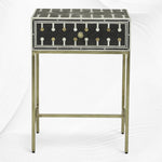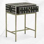 This bedside table is perfect for bringing a luxurious accent to your home. It's meticulously crafted by hand from inlaid bone as well as resin and is polished with brass hardware.