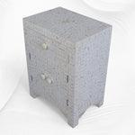 Bone inlay provides a natural, matte texture, while Mother of Pearl inlay gives a shiny, elegant look with its iridescent finish. Both materials are available in various patterns on all furniture and homeware items in our online store.