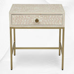 This bedside table is perfect for bringing a luxurious accent to your home. It's meticulously crafted by hand from inlaid bone as well as resin and is polished with brass hardware.