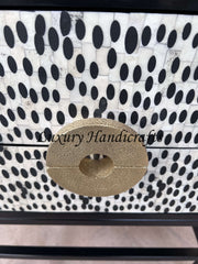 Bone inlay provides a natural, matte texture, while Mother of Pearl inlay gives a shiny, elegant look with its iridescent finish. Both materials are available in various patterns on all furniture and homeware items in our online store.