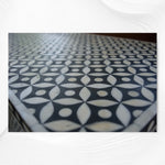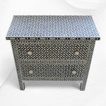 Bone inlay provides a natural, matte texture, while Mother of Pearl inlay gives a shiny, elegant look with its iridescent finish. Both materials are available in various patterns on all furniture and homeware items in our online store.