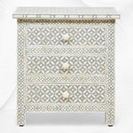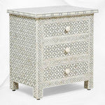 Our bone inlay Bedside will compliment existing bedroom furnishings and add that unique character to your peaceful space! Consisting of 3 drawers for ample bedside storage, It is lovingly created with the use of camel bone and resin to cleverly design whichever exquisite pattern for you.