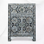 Infinitely intricate, our Kaleidoscope collection is made from hundreds of tiny pieces of bone, carved by the skilled hands of artisans in India and pressed into black resin to create swirling geometric patterns. Its single drawer and cupboard are painted black inside and finished with monochromatic striped handles.