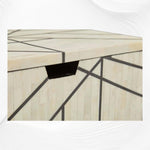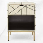 The Nola Full Bone Inlay Bedside is an exquisite piece that combines the best of contemporary and industrial design. Finished in ivory white, this bedside table features striking geometric black prints across the surface, adding a modern twist to a traditional bone inlay style. This piece blends industrial style with contemporary flair, making it an ideal addition to any bedroom.
