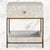 Mix Of Materials: Nora features a delightful mix of materials. The rectangular bone inlay tabletop and a shelf rest on a metal frame. The door knob is also made in metal, picturing the perfect amalgamation of golden metal with bone inlay.