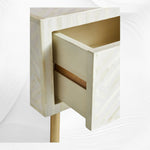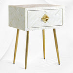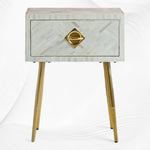 Featuring intricately patterned bone and inlaid brass hardware, this storage nightstand is a sleek, stately choice for your home. r. Its striking optical bone inlay design adds a touch of elegance and sophistication to the room. The single drawer offers convenient storage for bedside essentials, while the top surface provides space for a lamp, books, or other items.