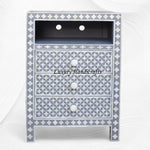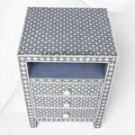 A bone inlay bedside table in a star design, with a grey color scheme, offers a unique blend of functionality and aesthetics for your bedroom. Crafted with meticulous attention to detail, this piece typically features intricate bone inlay work arranged in a star pattern, adding a touch of sophistication to any space.