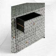The Midtown Bone Inlay Buffet with three drawers and two doors in black is a sophisticated and stylish piece of furniture designed to elevate any living space. This buffet combines functionality with artistry, featuring intricate bone inlay work that is meticulously handcrafted. The black background of the buffet serves as a striking contrast to the white bone inlay, creating a visually captivating piece that can serve as a focal point in any room.