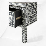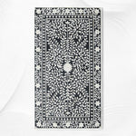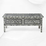 Bone inlay gives a natural, rustic look with a matte finish, while Mother of Pearl inlay shines beautifully with its iridescent glow. Both materials can be used in different patterns on any furniture or homeware items in our online store.
