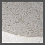 A White Bone Inlay Center Table with Brass is a distinctive piece of furniture known for its intricate craftsmanship and elegant design. The inlay work involves embedding shaped pieces of camel bone into a base, typically made of wood or resin, to create elaborate patterns and motifs. This process is done by skilled artisans, often from regions like Rajasthan, India, where bone inlay has been a traditional craft for centuries.