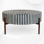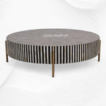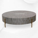 Simplistic and bold, this luxurious round coffee table is an exercise in contrast, featuring a hypnotic art deco design. A white and black camel bone and resin adds a visual statement that contrasts with its simple construction and delicate Iron base with brass finish.