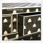 This fabulous bone inlay Chest is a remarkable feat of superior craftsmanship and design. Created from wood solids the finished overlay features bone inlays formed and shaped in a fabulous, with beautiful brass knobs like drawer pulls. Variations in bone inlay are not uncommon, giving each piece one-of-a-kind distinction.