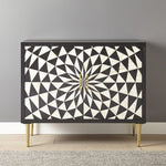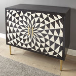 - Meticulously handcrafted, our Bone Inlay Artifact 2 Door Cabinet in Black boasts intricate detailing that adds a touch of timeless elegance to any space.