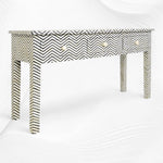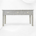 A hero piece with unique style, the three drawer wooden bone inlay console commands attention in any room. Camel bone and resin make up a classic chevron pattern, exclusive to Luxury Handicrafts.