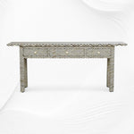 A hero piece with unique style, the three drawer wooden bone inlay console commands attention in any room. Camel bone and resin make up a classic chevron pattern, exclusive to Luxury Handicrafts.