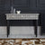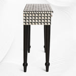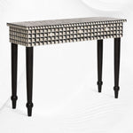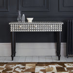 Monochrome bone inlay gives this console a quirky 3D twist. This contemporary table would make a striking impression in a hallway, home office or even a bedroom.