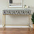 Taking cues from sunflower pattern, hand-inlaid bone gives this piece a touch of intricate, ornate detailing. Perched atop thin brass legs, its versatile silhouette can be used as a makeup vanity, a desk for a home office, or even an entryway console.