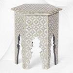 This petite bone inlay side table in Hexagonal structure and geometrical bone inlaid design would make a perfect accent in any room.