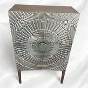 Expertly crafted hand hammered sheet metal on a solid wooden frame featuring two elegantly patterned doors with inner shelving and drawers for all your barware.