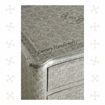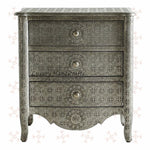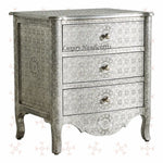 Featuring a base of antiqued silver metal, this three drawer nightstand elevates your bedside display. Key Features: # Dimensions: 26" (Length) X 19" (Width) X 28" (Height) Inches # Silver metal embossed # 3 fully...