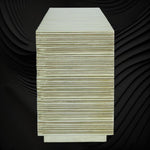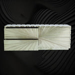 This product has an Art Deco-inspired, textured starburst pattern made of white alloy metal with a protective coating and four drawers with metal runners and premium knobs.