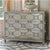 This silver chest of drawers is covered in bright white metal with a lattice design. Shimmering, three-dimensional geometric detail grace the front of three generously-sized drawers with decorative nickel-plated brass pulls. Each drawer has a hand painted interior with full extension metal gliders, making this piece as functional as it is gorgeous.