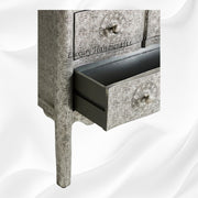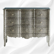 Inspired by Eastern design, this hand-embossed dresser is crafted in a curvilinear design for optimal storage and style. Key Features: # Size: 45" (Length) X 18" (Depth) X 35" (Height) Inches # Hand stamped nickel...