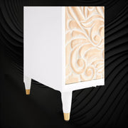 The warmth of this solid tropical hardwood cabinet invites a classic, bohemian-inflected aesthetic into your space. Meticulously carved in an appealing, all-over floral motif, it's finished with brass-capped hardware and legs to complete its cool, yet refined look.