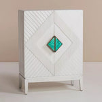 Carved and painted completely by hand, our Samuel collection features exaggerated, geometric hardware that is from bras, and embellished with pink and white agate stone. Profoundly versatile, this gorgeous storage cabinet provides statement-making storage in an entryway, bedroom, or living room.