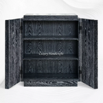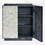 The Plexus cabinet combines black cerused with tessellated selenite inlaid into the doors and top. Simply finished internally with two cerused oak shelves. The doors have an integrated finger notch, removing the need for separate handles. This cabinet is an example of the work we do with more unusual materials for creating our bespoke and customized furniture. We can produce any size of cabinet in a variety of finishes.