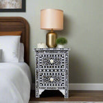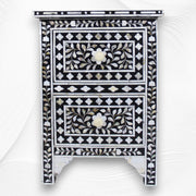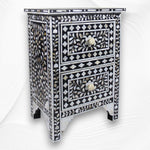 Our signature classic mother of pearl inlay table in floral inlay. The Mother of Pearl inlay gives the same striking statement of bone inlay furniture, with the addition of the shimmer and sparkle of hundreds of Mother of Pearl pieces.