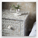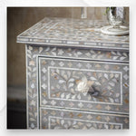 Our signature classic mother of pearl inlay table in floral inlay. The Mother of Pearl inlay gives the same striking statement of bone inlay furniture, with the addition of the shimmer and sparkle of hundreds of Mother of Pearl pieces.