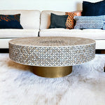 Since the days of ancient Egypt, craftsmen have been using inlaid mother of pearl to decorate furniture surfaces, and for good reason: it embodies a natural sheen that adds instant luxury to any space. Handcrafted using the same centuries-old technique at Luxury Handicrafts, this room-anchoring piece captures the essence of Moroccan tile work with a reiterative mop inlay design atop a cylindrical brass base.