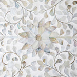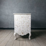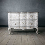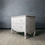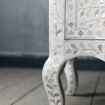 A French Renaissance inspired chest of drawers. Beautifully handcrafted in Udaipur, India by a team of our skilled artisans, pieces of carved mother of pearl have been hand carved and lovingly set into colourful resin creating a charming and floral design. Featuring two large drawers for ample storage.