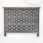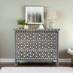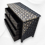 This classic bold black colored Mother of Pearl Inlay Chest of Drawers, is hand-carved using the ancient inlay tradition of India, this elegant chest with four drawers is made by local artisans using responsibly sourced mother-of-pearl. Its Bold black color and one-of-a-kind variations make it a stunning piece for the home.