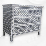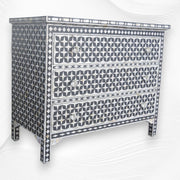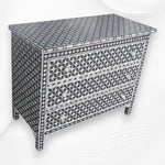 In a contemporary star design, traditional mother of pearl inlay craftsmanship is used to make this bright teal chest of drawers. With three large drawers, bedroom storage has never been so beautiful.