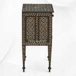 Precisely inlaid mother of pearl in a melange of traditional Rajasthani patterns gives the Bhawana nightstand loads of charm. The nightstand sits upon delicately tapered legs with spade foot detail. One drawer and double bottom doors provide good storage.