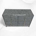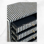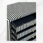 An opulent two-drawer bedside table with an bone inlay and green geometric stripe design. Each one is handcrafted in India, expertly embellished with individual pieces of bone inlay that have been set into green resin.