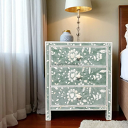 Indulge in the luxury of a meticulously crafted and finely detailed Blooming Flowers bone inlay bedside table with 3 drawers. The details of this furniture can steal attention at one glance. At the same time, the 3-drawer bedside table gives you practical storage space that makes it more purposeful, leaving behind a fascinating and functional bone inlay furniture.