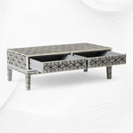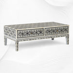 Bone inlay gives a natural, rustic look with a matte finish, while Mother of Pearl inlay shines beautifully with its iridescent glow. Both materials can be used in different patterns on any furniture or homeware items in our online store.
