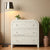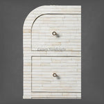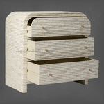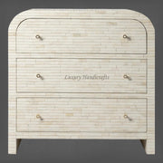 An opulent three drawer dresser with an curved bone inlay work. Each one is handcrafted in India, expertly embellished with individual pieces of bone inlay that have been set onto premium wooden structure.
