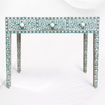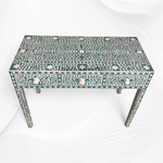 This stunning White Mother of Pearl Inlay Console Table by Luxury Handicrafts is a very special piece with sophisticated design and intricate carved MOP details. The gorgeous combination of blue with shimmering mother of pearl has everlasting appeal and creates a relaxed bohemian elegance in your home.