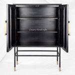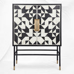 The Junto cabinet is a captivating statement of modern elegance. Its sleek black frame beautifully highlights the exquisite black and natural bone inlay design. Each tile is expertly hand-cut and carefully arranged by skilled artisans to form a detailed geometric pattern, making this piece a remarkable example of craftsmanship and style.
