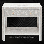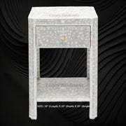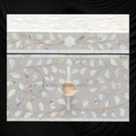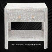A shell-inlay floral design made from mother-of-pearl adds an iridescent sheen to this ultra-feminine piece. The small, intricate shellwork is handset and makes the bedside sparkle with depth. Bottom mount drawer hinges in the dresser and nightstands make them as practical as they are pretty.