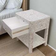 A shell-inlay floral design made from mother-of-pearl adds an iridescent sheen to this ultra-feminine piece. The small, intricate shellwork is handset and makes the bedside sparkle with depth. Bottom mount drawer hinges in the dresser and nightstands make them as practical as they are pretty.