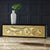 A solid wood cabinet perched on solid brass legs and featuring our signature music pattern. The design is carved onto wooden doors, and then clad in a single sheet of brass, which is hand-hammered and polished to perfection. The labor-intensive process takes eight to 12 hours per door.