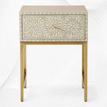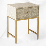 Bone inlay provides a natural, matte texture, while Mother of Pearl inlay gives a shiny, elegant look with its iridescent finish. Both materials are available in various patterns on all furniture and homeware items in our online store.