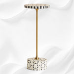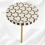 This elegant end table features a stunning black and white bone inlay design, meticulously handcrafted to create a geometric, mosaic-inspired pattern. Its clean and minimalist silhouette is enhanced by a gold-finished metal stem, adding a touch of luxury to the overall aesthetic. Compact and versatile, this table is perfect as a side or accent piece, effortlessly blending into both modern and traditional interiors.