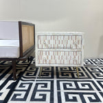An opulent two-drawer bedside table with an bone inlay and brown geometric stripe design. Each one is handcrafted in India, expertly embellished with individual pieces of bone inlay that have been set into brown resin.
